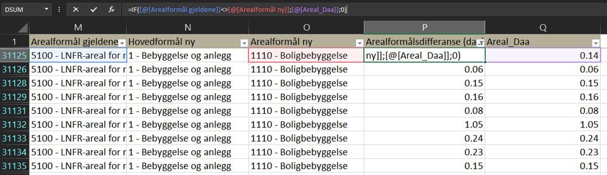 =SUMMERHVIS(Kolonnen Arealformål_ny fra Rådata-fanen: Kolonne Arealdifferanse (Daa) fra Rådata-fanen; [@[Kolonnen KPAREALFORMÅL-Ny i Arealformålsendring-fanen]; Kolonne Arealdifferanse (Daa) fra Rådata-fanen)