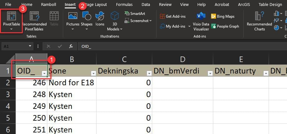 For å lage en tabell over omdisponering av arealer mellom hovedformål kan du lage en pivottabell fra rådata-fanen.