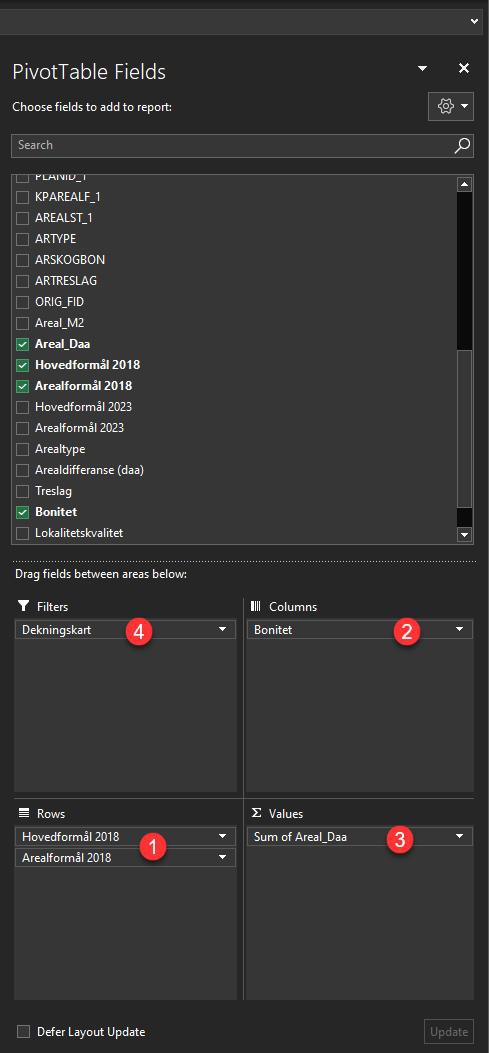 Legg inn arealformål og hovedformål som rader (1), dyrkbar jord som kolonne (2), Areal_Daa som verdier (3) og arealtype som filter (4).