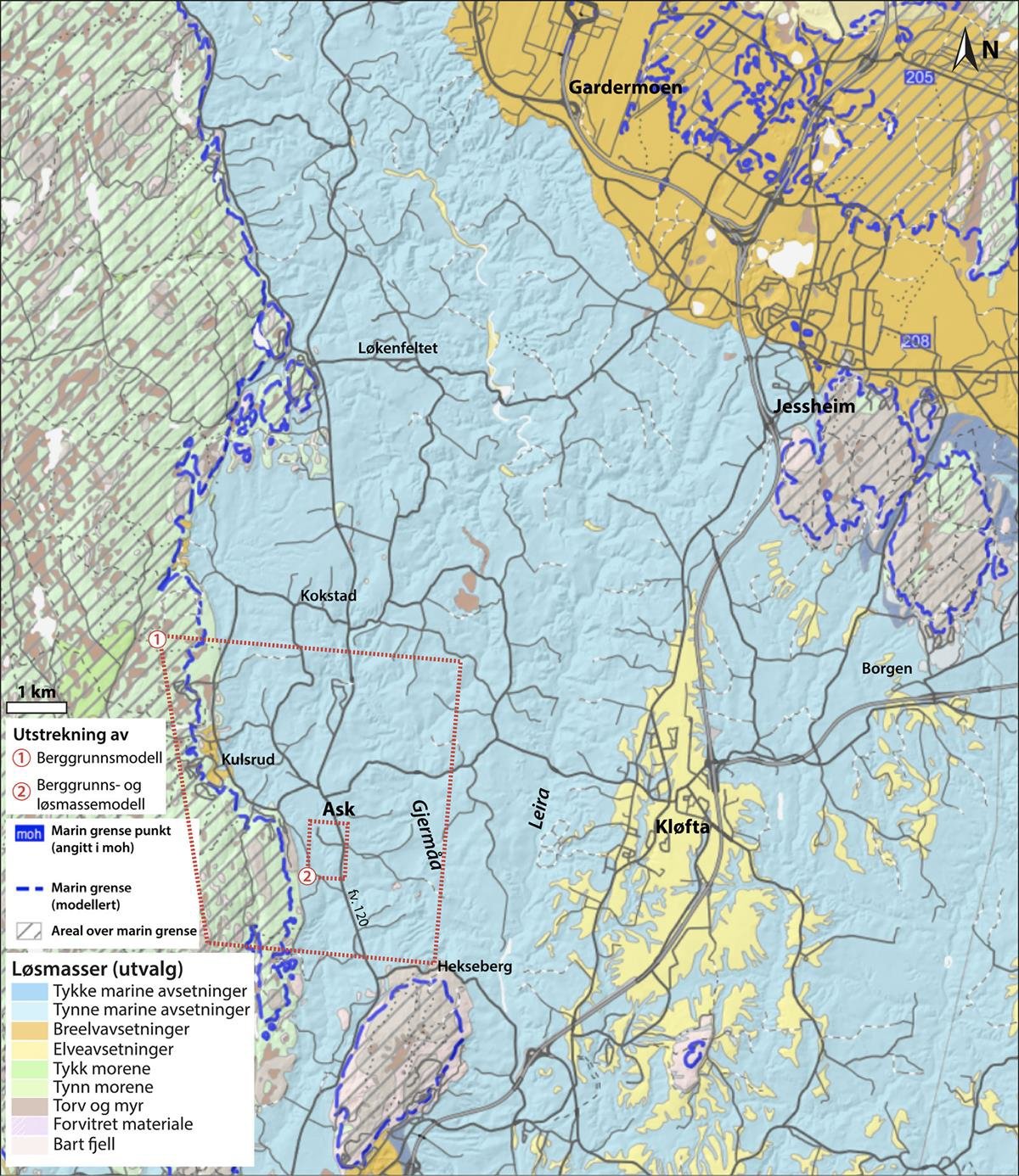 Figur 5.3 Kvartærgeologisk kart med marin grense for deler av Romerike. Marine avsetninger består i hovedsak av leire, men inneholder også andre løsmassetyper. Området er kartlagt av (Østmo & Olsen, 1978) og (Longva & Østmo, 1986), se NGU (2021c) for mer detaljer på kartet.