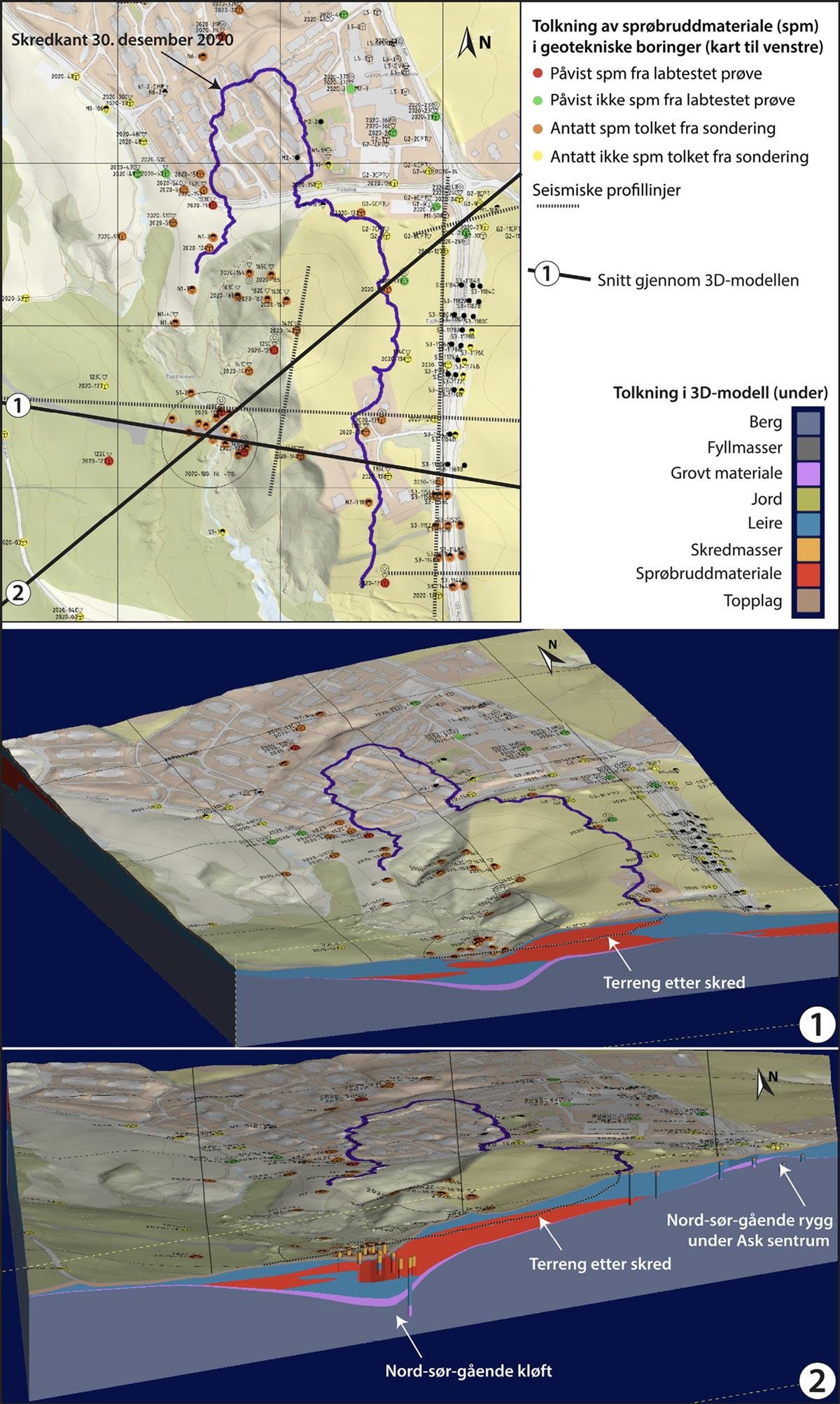 Data fra geotekniske boringer og seismiske målinger er benyttet av Multiconsult for å lage en 3D-modell i programvaren Leapfrog, over et ca. 0,6 km2 stort område rundt skredhendelsen på Ask (Multiconsult, 2021b) (Figur 5.6). Denne modellen ble laget for å få oversikt over både bergtopografi og lagdeling i løsmassene, for å bedre forståelsen av grunnforholdene i og rundt skredområdet. Disse data ble også benyttet i NGU-modellen over berggrunnstopografien.