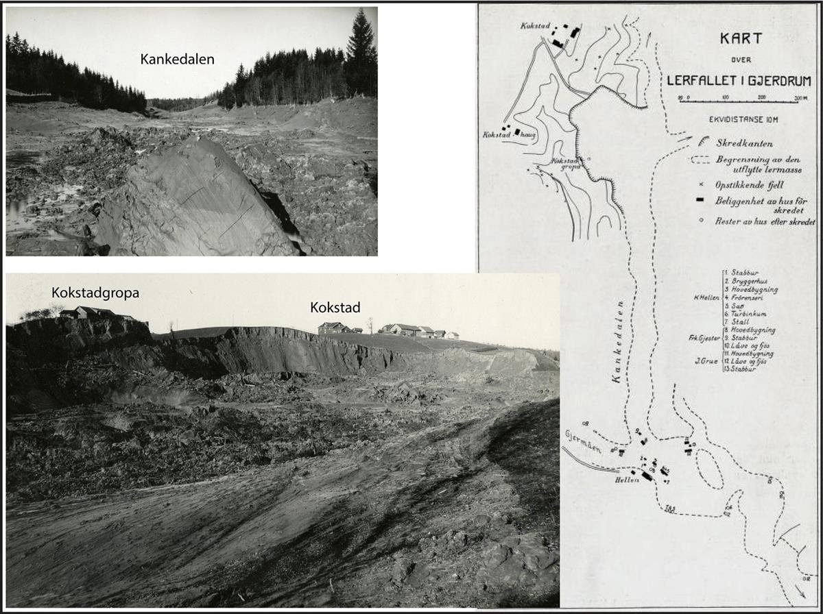 Figur 5.9 Kart og foto over skredet ved Kokstad i 1924. Skredkantene mot Kokstadgårdene var bratte. Skredmassene fylte Kankedalen. Modifisert fra (Holmsen, 1929)