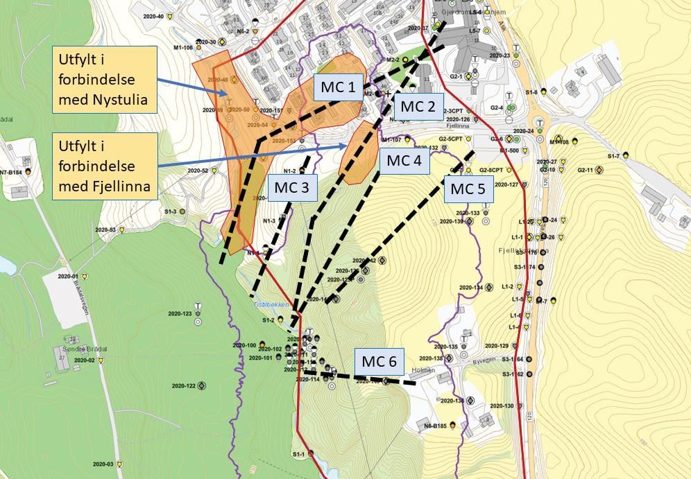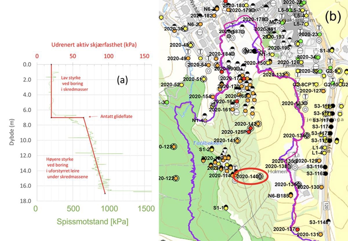 Det er nesten ikke gjort geotekniske grunnundersøkelser i det området som ble berørt av skredet 30. desember 2020 (Figur 5.7). Mobiliteten til skredmassene som rant 2 km gjennom et ravinert område, og hvordan skredmassene la seg nokså flatt i bunnen av skredgropa, tilsier at mye av leira må ha vært kvikk. Grunnundersøkelsene fra før skredet ga ikke klare indikasjoner på dette. Grunneier har påpekt at dyrkingsjorda nord for Holmen var svært hard og lite sensitiv leire. Denne la seg som store flak av tørrskorpe i sørdelen av skredgropa.