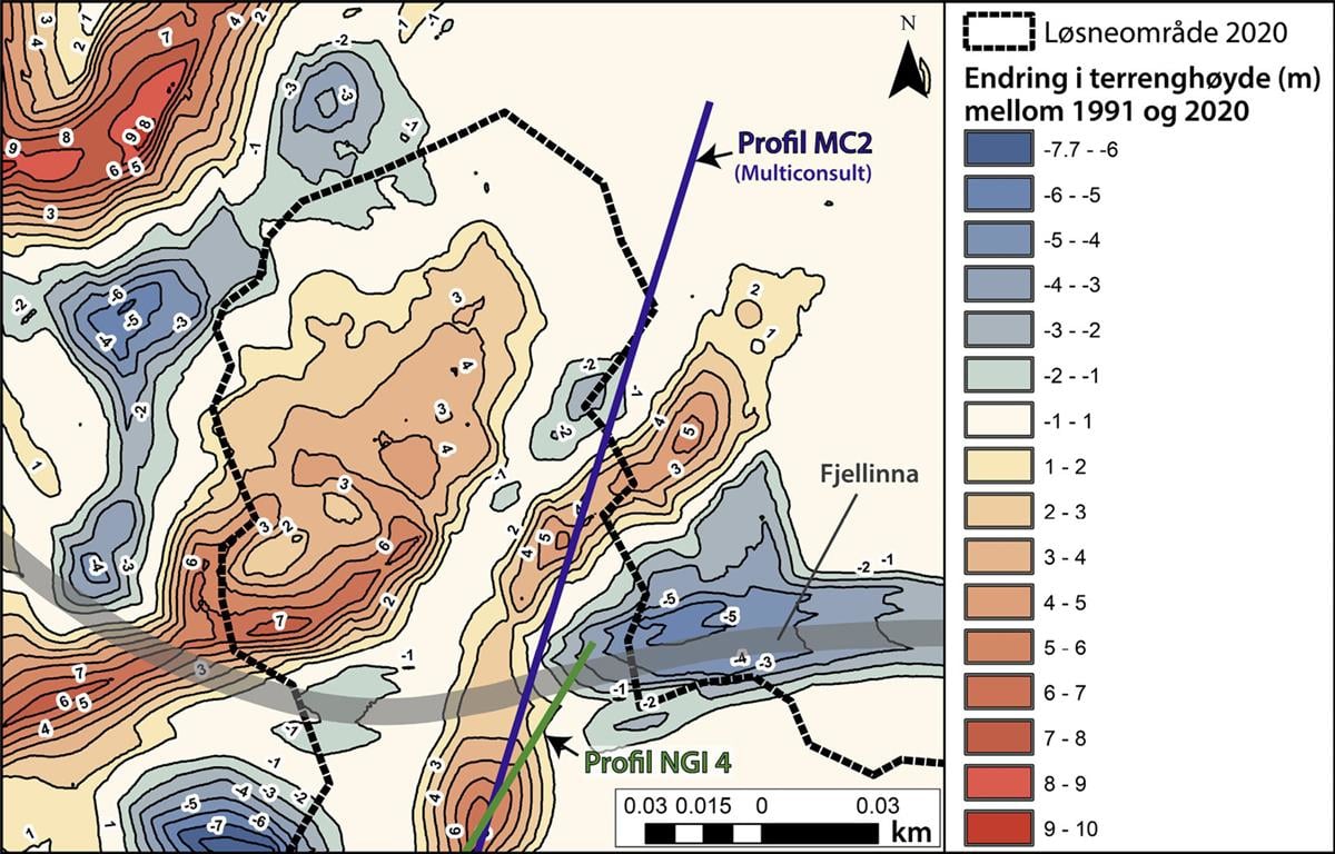 Figur 5.34 Endringer i lengdeprofil (terrengoverflate) langs Brådalsbekken og Tistilbekken basert på sammenligning av Kartverkets terrengmodeller fra 2007 og 2020 (Penna & Solberg, 2021).
