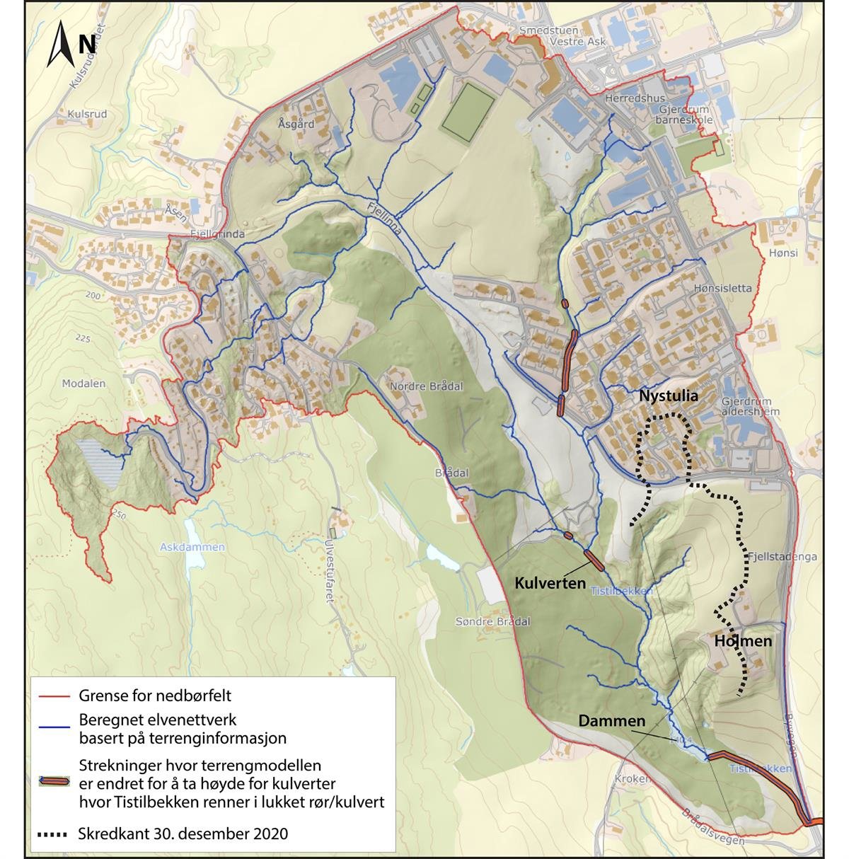 Det finnes ikke direkte målinger av nedbør eller vannføring i Tistilbekkens nedbørfelt. Vannføringen i Tistilbekken er derfor simulert av NVE ved hjelp av den hydrologiske modellen DDDUrban. Simuleringene sammenholdt med observasjoner fra nærliggende målestasjoner understøtter at det ikke var ekstreme vannføringer i Tistilbekken høsten 2020, men en rekke episoder med høy vannføring. Den høyeste vannføringen var simulert 27. desember på nivå omkring årsmiddelflom. Dette er en vannføring en statistisk kan forvente å komme opp på med 2-3 års mellomrom.