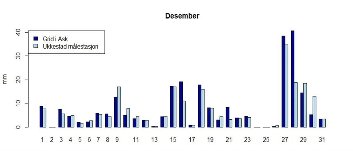 Figur 5.27 Daglige nedbørverdier i desember 2020 for Ukkestad målestasjon og beregning for Ask fra senorge.no (NVE, 2021)
