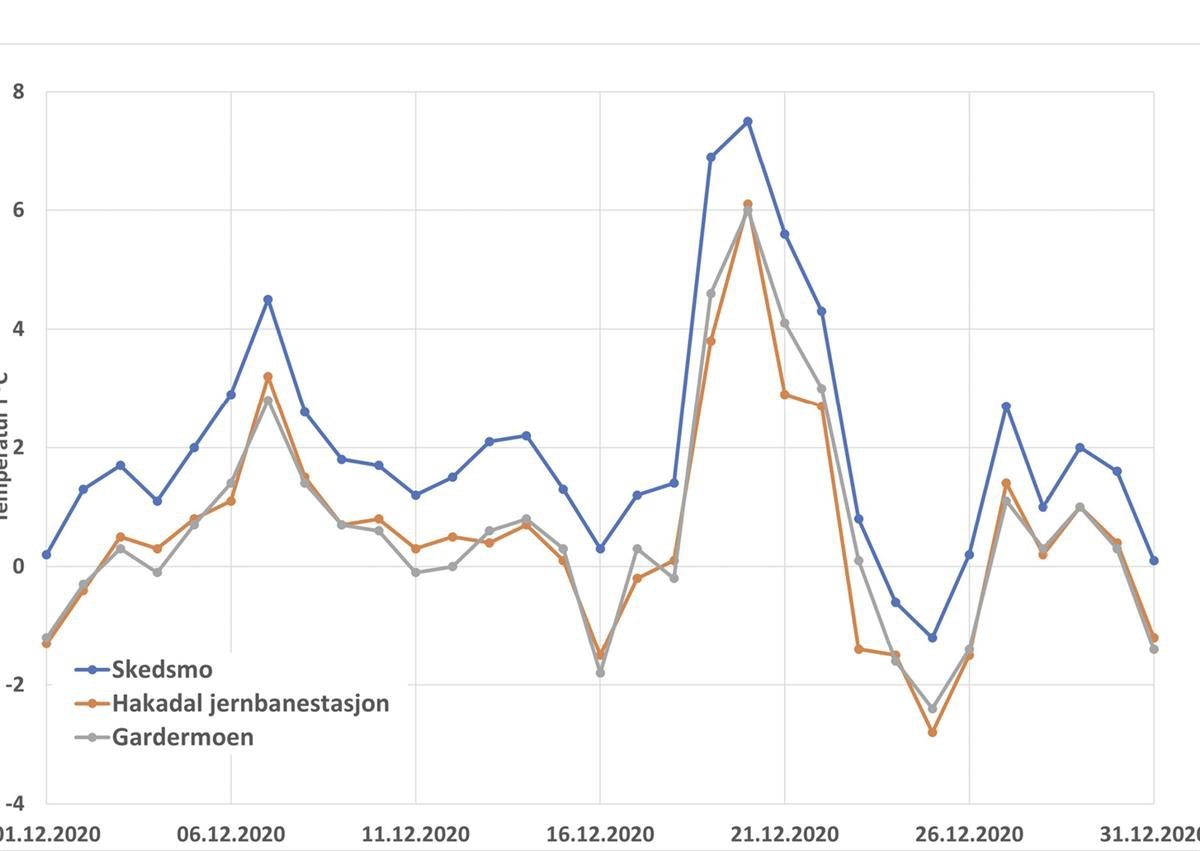 Figur 5.29 Målt døgnmiddeltemperatur for desember ved tre nærliggende målestasjoner: Gardermoen, Hakadal og Skedsmo (NVE, 2021).