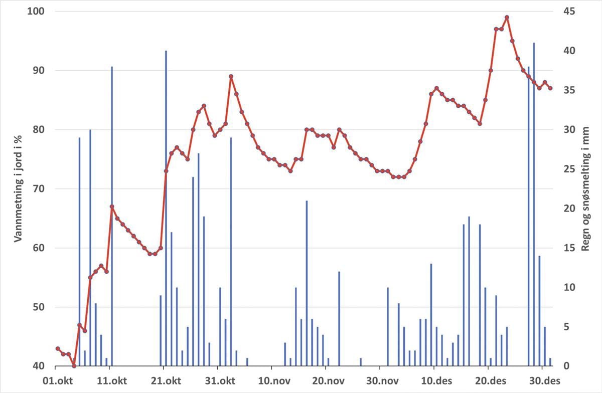 Figur 5.30 viser daglige verdier for simulert vannmetning i bakken og sum regn og snøsmelting ved Ask, for perioden oktober til desember 2020. Simuleringen indikerer høy vannmetning i bakken og stor avrenning i dagene før skredet gikk.