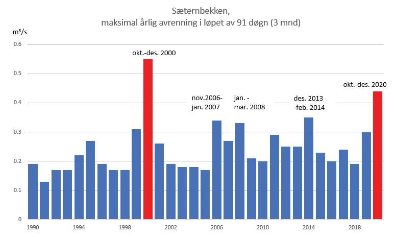 Figur 5.31 Maksimal gjennomsnittlig avrenning ved Sæternbekken målestasjon i løpet av en 3-månedersperiode for årene 1990 – 2020 (NVE, 2021).