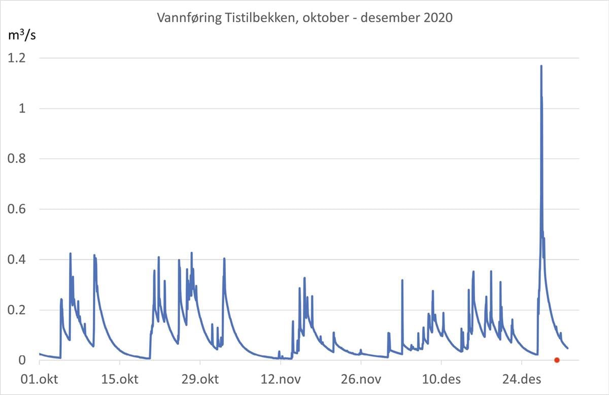 Beregningene ga en vannføring i Tistilbekken 27. desember 2020 på ca. 1,2 m3/s (input fra SeNorgeV2). Dette er en høy, men ikke ekstrem vannføring. Hverken nedbørintensitet eller avrenning var ekstreme i desember 2020. Mer intens nedbør og høyere avrenning er simulert for to andre tidspunkt i løpet av den relativt korte tidsserien NVE hadde til rådighet. Det er 17. september 2015 med 2,0 m3/s og 11. november 2018 med 1,7 m3/s (input SeNorge2018).