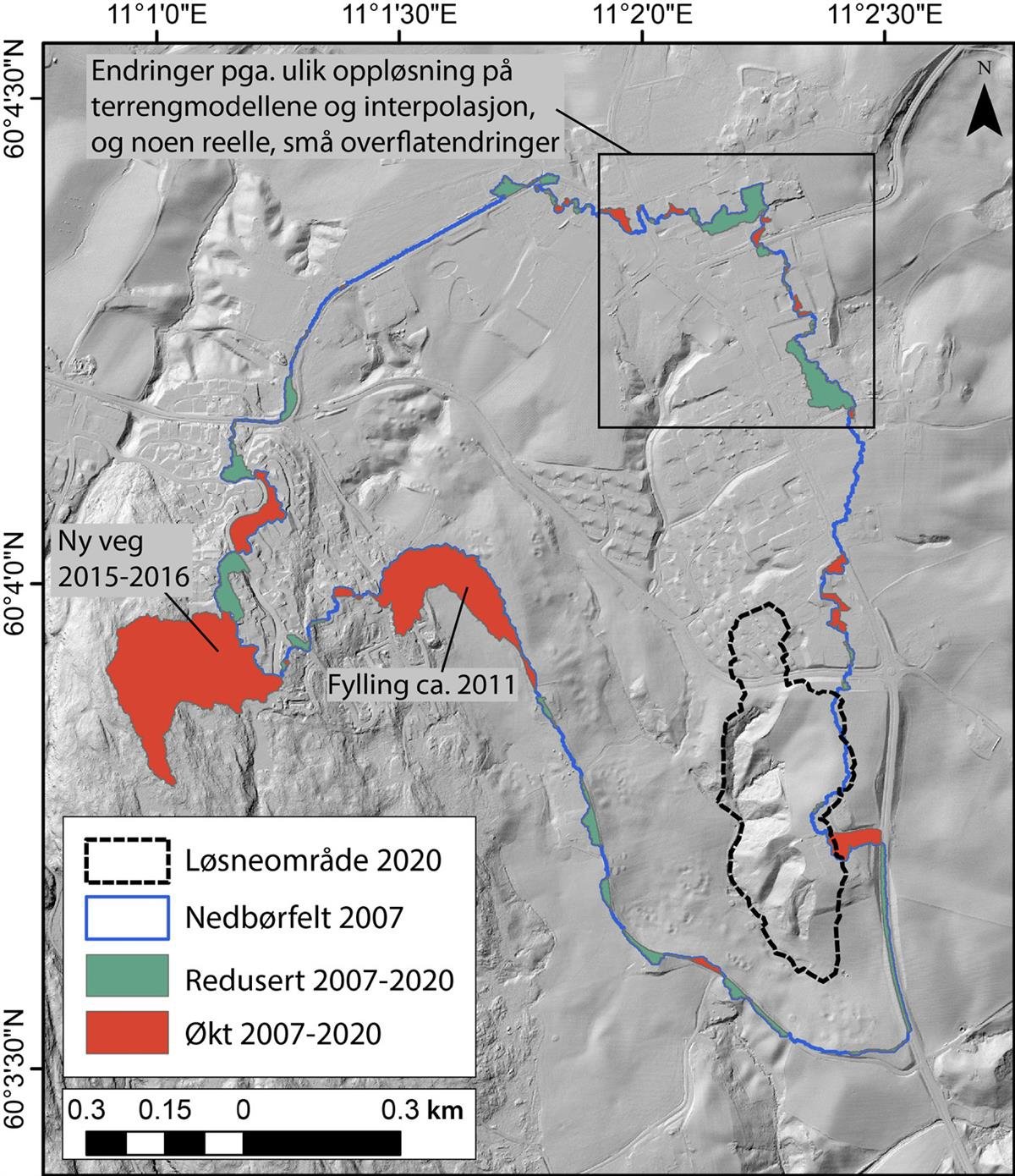 Figur 5.33 Endringer i nedbørfeltet til Tistilbekken fra 2007 til 2020. Analysene er basert på terrengmodeller og inkluderer derfor ikke rør o.l. som ligger under overflaten (Penna & Solberg, 2021).