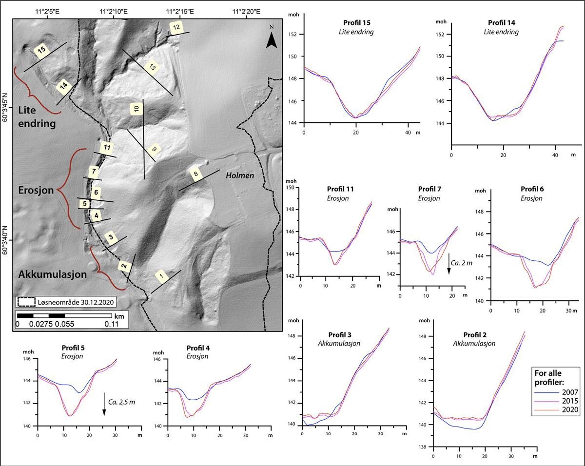 Figur 5.36 Endringer i tverrprofiler for data fra 2007, 2015 og 2020 nedstrøms kulverten i Tistilbekken, som viser hvor det har vært erosjon (nedskjæring) og akkumulasjon (avsetning) av løsmasser i ulike deler av bekken. I alle profiler er venstre vestlig og høyre østlig retning (Penna & Solberg, 2021).