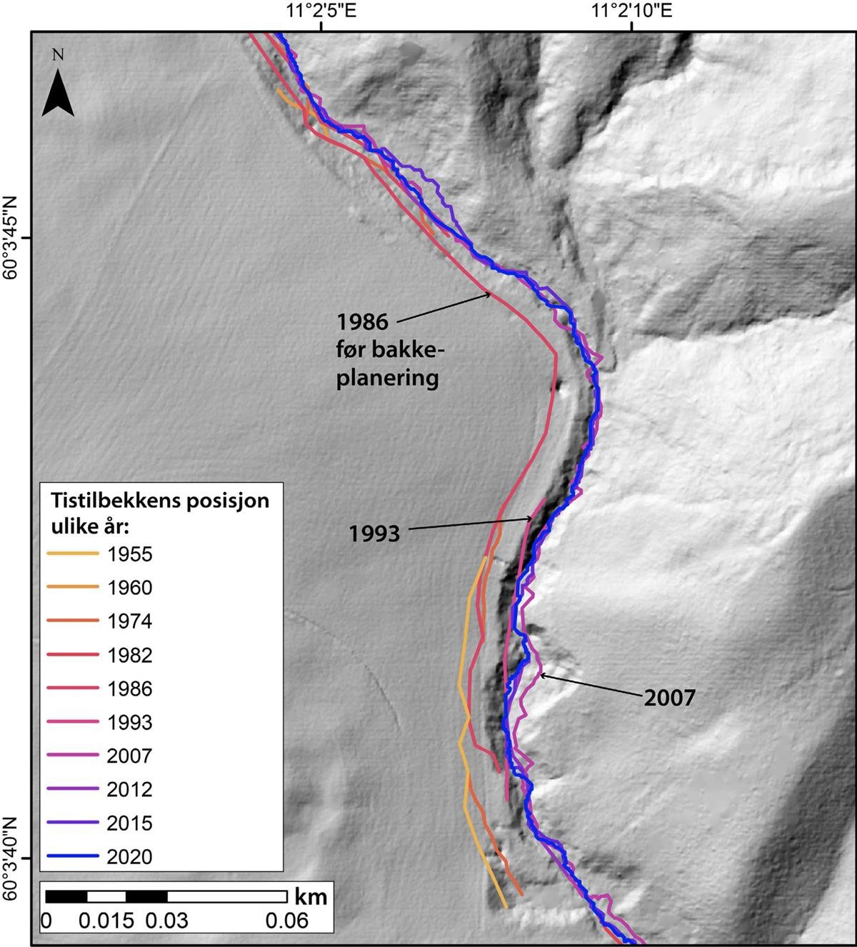 Figur 5.38 Ulike posisjoner Tistilbekken har hatt fra 1955 til 2020. Terrengmodellen brukt som bakgrunnskart er fra 2020. Basert på flyfoto og terrengmodeller fra Kartverket, se detaljer om analysene i Penna & Solberg (2021).