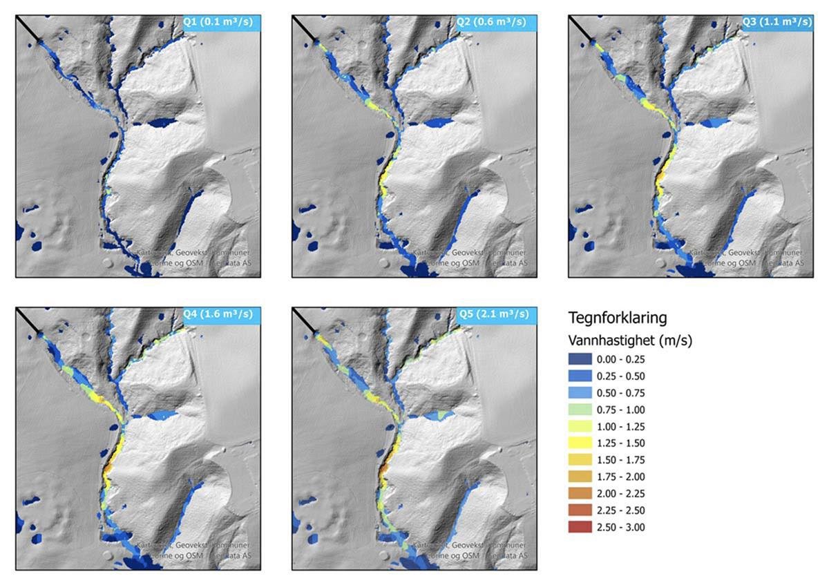 Den hydrauliske modellen er brukt til å beregne vannhastigheter på strekningen for fem ulike vannføringer: 0,1 m3/s, 0,6 m3/s, 1,1 m³/s, 1,6 m³/s og 2,1 m³/s.