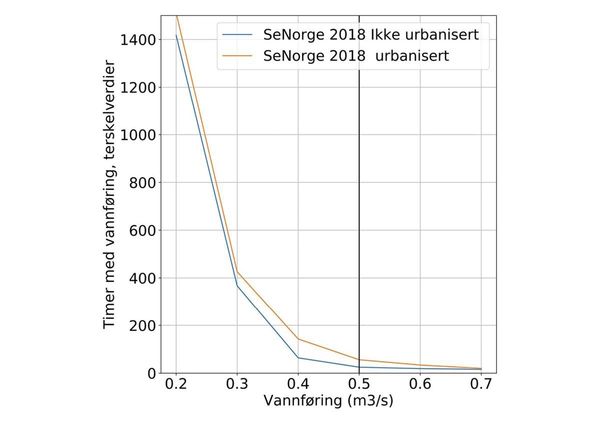 Det neste spørsmålet er hvor ofte en slik vannføring opptrer, og hvor stor forskjellen er mellom situasjonen med urbanisering kontra uten urbanisering. NVE har beregnet tidsserier med og uten urbanisering og med to ulike datasett: SeNorgeV2018 og SeNorgeV2. Det er liten endring i frekvensen av de maksimale vannføringsverdiene som følge av urbanisering. NVEs modellering viser imidlertid en økning på grunn av urbanisering i hyppigheten av små vannføringstopper (NVE, 2021).