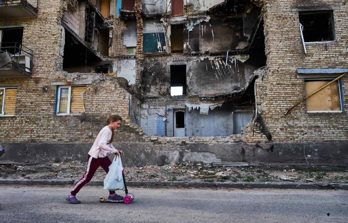 Krig og usikkerhet: En jente sparkesykler forbi en ødelagt blokk i landsbyen Horenka i Ukraina, om lag et år etter Russlands angrep på Ukraina 24. februar 2022. (Foto: Iva Zimova/Panos Pictures/Felix Features)