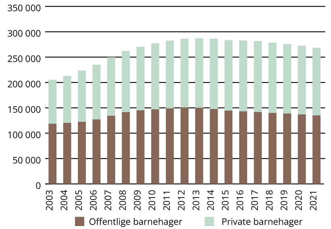 Som beskrevet i kapittel 1, opprettet staten en rekke økonomiske støtteordninger som skulle gi insentiver til å bygge og drive private barnehager etter barnehageforliket i 2003. Det var også flere private aktører som fikk billige tomter fra kommunene. Full økonomisk likeverdig behandling av kommunale og private barnehager var ett av målene i barnehageforliket. I 2009 ble rett til barnehageplass innført. Det er kommunen som skal sørge for at retten til plass oppfylles. I perioden fra 2003 til 2013 økte antall barn i barnehage med 82 000. Senere har antall barn i barnehage falt i takt med synkende barnekull, men dekningsgraden har økt.