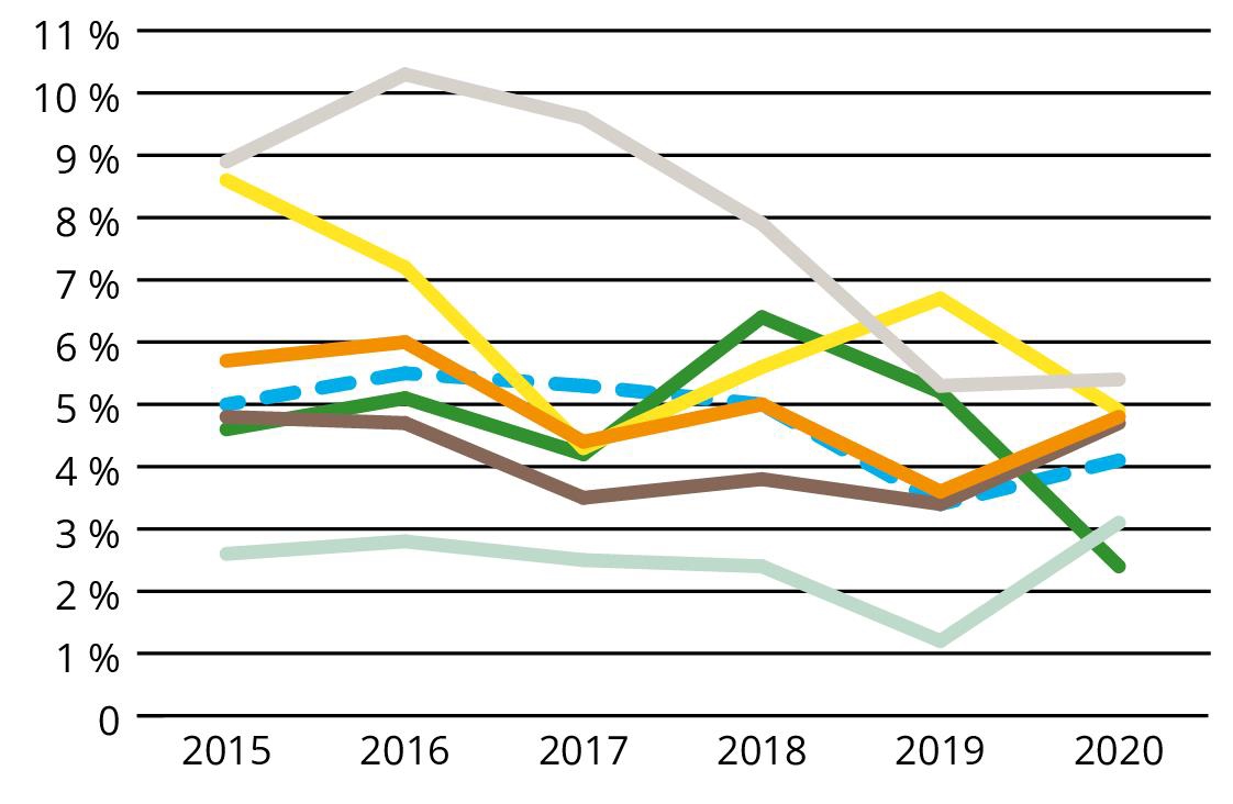 | Totalt | 5,0 % | 5,5 % | 5,3 % | 5,0 % | 3,4 % | 4,1 % |