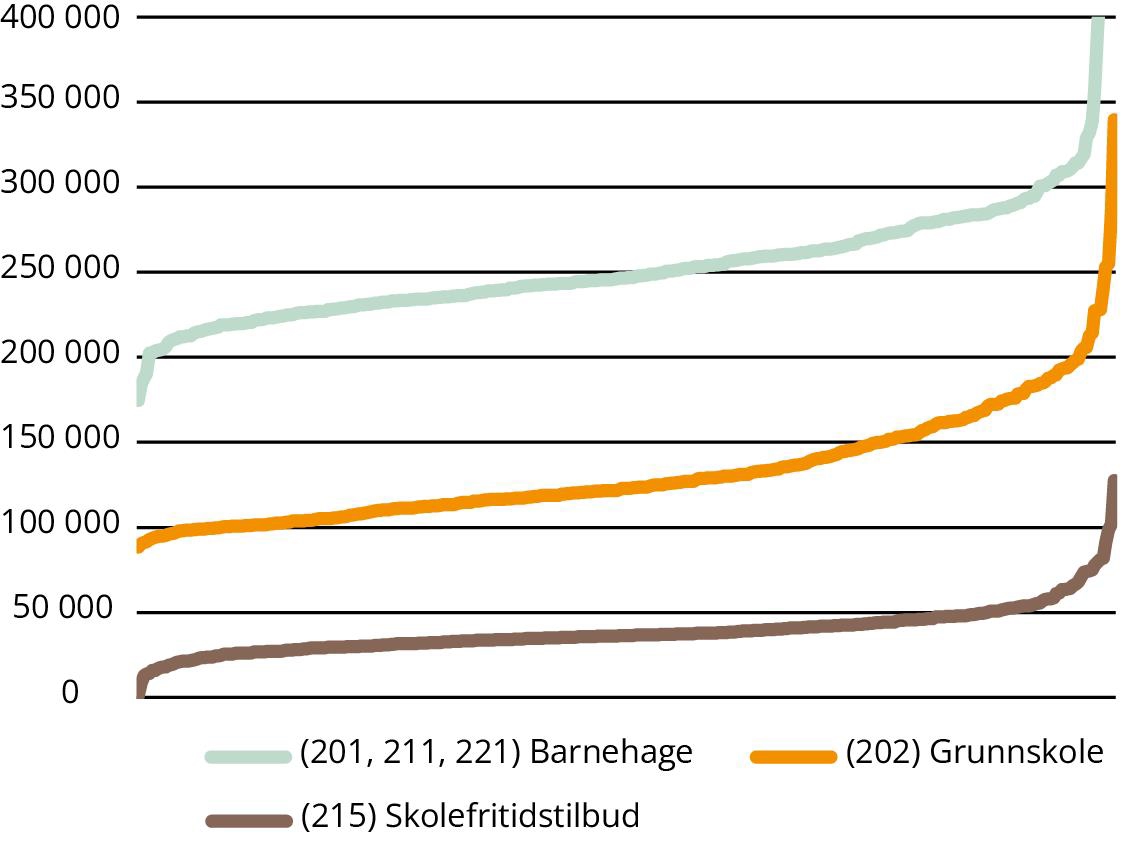 Merknad: De kommunale utgiftene for hver sektor er rangert fra lavest til høyest uavhengig av kommune, dvs. at figuren ikke kan brukes til å sammenligne en gitt kommunes utgifter til hhv. SFO/skole/barnehage.