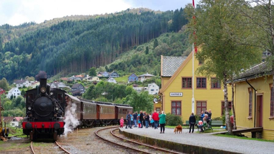 Garnes stasjon, Bergen. Gamle Vossebanen opna i 1883, og strekninga mellom Tunestveit og Mitdtun er freda. Det er museumstogdrift på banen.