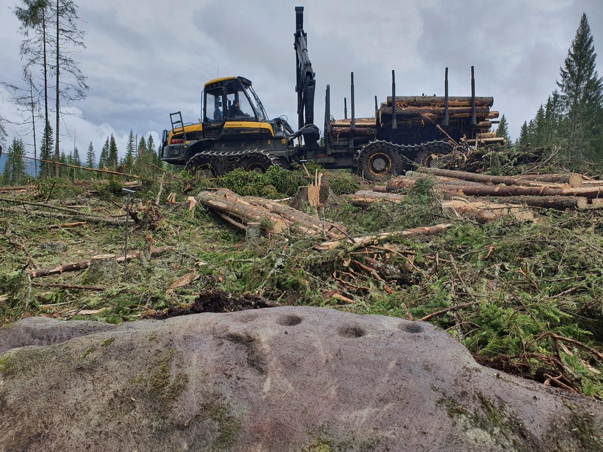 I skogen finnes det kulturminner fra alle tider. Her under hogst i et område med bergkunst (skålgroper) fra bronsealder eller jernalder.
