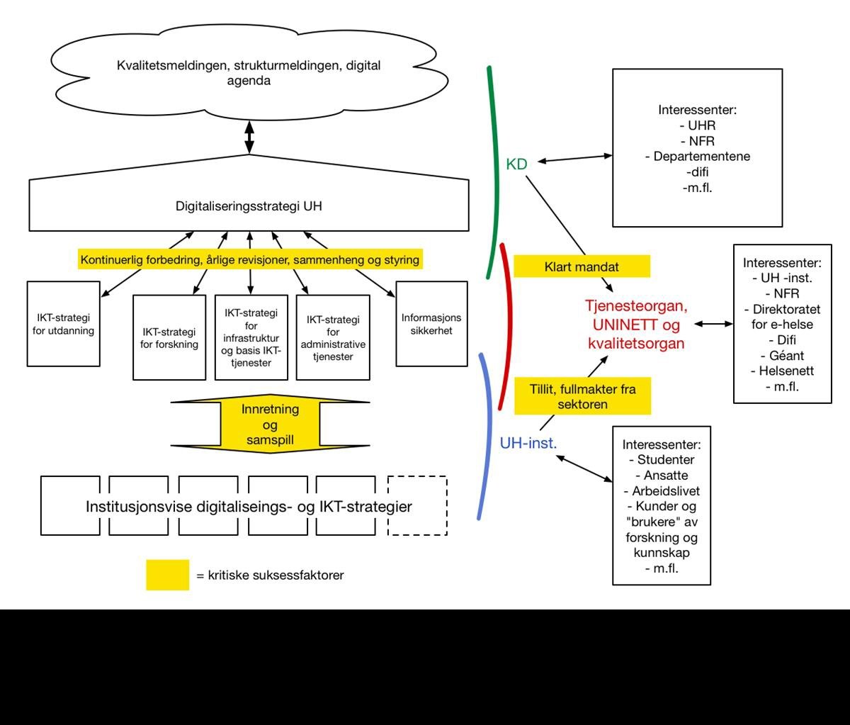 Det er vanskelig å forutse de samlede konsekvensene digitaliseringen av samfunnet vil ha for UH-sektoren og hva dette innebærer for styring og strukturer. For å kunne møte grunnleggende endringer bør styringslinjer og strukturer rigges på en slik måte at de er i stand til å håndtere raske skifter i rammevilkårene på sektornivå. Styringen av digitalisering i UH-sektoren foregår på flere nivåer med tilhørende strategier og interessenter. Flernivåstyringen og forholdet til de forskjellige strategiene er forsøkt illustrert i figuren nedenfor.