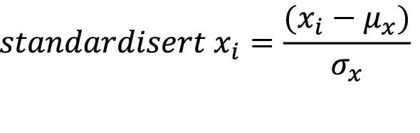 Alle indikatorene måler i utgangspunktet forskjellige fenomener. For å kunne måle indikatorene etter samme skala, standardiserer vi indikatoren. Standardisering gjøres etter følgende formel der xi er indikatorverdien for kommune i, µx er gjennomsnittet og σx er standardavviket for indikatoren x: