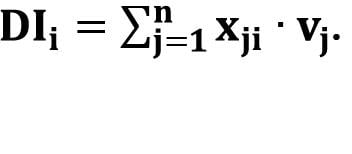Hvis vi kaller distriktsindeksen for kommune i for DIi, den enkelte standardiserte og trunkerte indikatorverdi for kommune i for xji for indikator j, n antall indikatorer og den enkelte vekt for indikatoren vj, så er