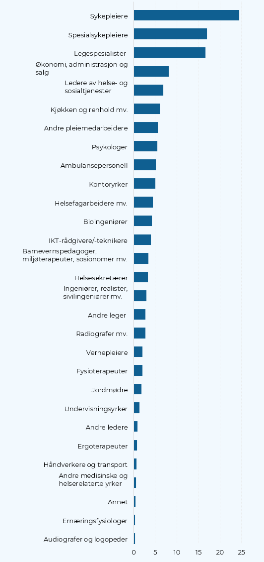 Helse og omsorg er en stor yrkessektor, med 20 prosent av norske sysselsatte (OECD, 2024). Dette er den største andelen i EU/EØS, foran Danmark med 18 og Nederland med 17 prosent. Norge, sammen med Østerrike og Kypros, har den høyeste dekningen leger, med 5 per 1 000 innbyggere. OECD (2024) viser at Norge også er i toppen når det gjelder sykepleierdekning, med 12 per sykepleiere per 1 000 innbyggere, samme som i Island, Finland, Irland og Tyskland. EU/EØS-snittet er 4,2 leger og 8,4 sykepleiere per 1 000 innbyggere.