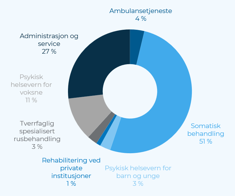 Somatisk behandling er størst med over halvparten av årsverkene (Figur 32). Administrasjon og service følger med 27 prosent. Psykisk helsevern har totalt 14 prosent, med henholdsvis 11 og 3 prosent for voksne og barn og unge. Ambulansetjenesten har 4 prosent av årsverkene, mens 3 prosent av årsverkene jobber innen tverrfaglig spesialisert rusbehandling (TSB). Andre helsefag med høyere utdanning utgjør 14 prosent.