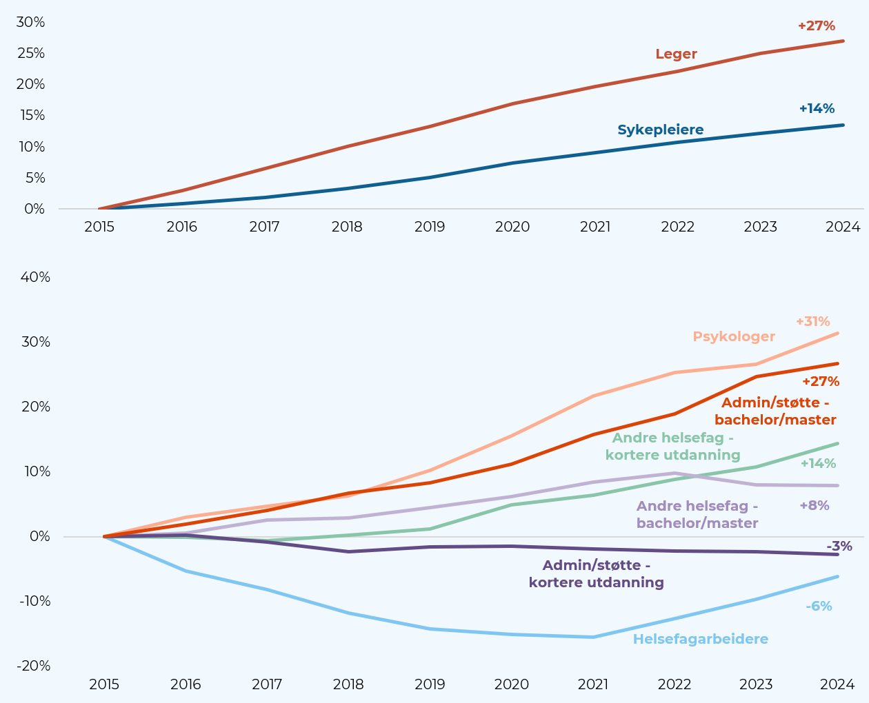 Siden 2015 har det derimot blitt færre helsefagarbeidere (6 prosent reduksjon). Selv om nivået er lavere enn i 2015, har det imidlertid vært økning i helsefagarbeidere siden 2019. Det har også vært en reduksjon innen årsverk i administrasjon og støttetjenester med kortere utdanning (3 prosent reduksjon).
