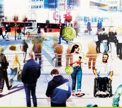 Fokus på nytt livsløp, en engasjert kvinne i hyggelig prat med sin venn i rullestol. Tegnet strek omfavner kvinnen og fører til symbolet «starte og drive en frivillig organisasjon». Streker trukket som nettverk mellom øvrige symboler, viser samspill mellom etatene.