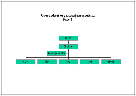 - allerede fra første stund etableres også fellestjenester - med egen avdelingssjef som leder - med ansvar for følgende funksjoner: administrasjon, økonomi, personal, IKT, juridiske spørsmål og informasjon/mediekontakt. I løpet av fase 1 vil det også være aktuelt å legge funksjonene salgsvirksomhet, sikkerhet og vakthold inn i fellestjenestene.