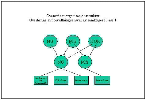 - fase 1 starter den 1. januar 2003 med etablering av den nye institusjonen med ett styre og en overordnet direktør med nødvendig administrasjon. Styret i den nye institusjonen overtar fra samme tidspunkt styrefunksjonene til Nasjonalgalleriet og Museet for samtidskunst. Budsjettmidlene bevilget av staten for 2003 til de fem aktuelle institusjonene, forvaltes av styret for den nye institusjonen. De tre stiftelsene har fremdeles sine styrer, som bl. a. skal godkjenne avtaler med styret for den nye institusjonen.