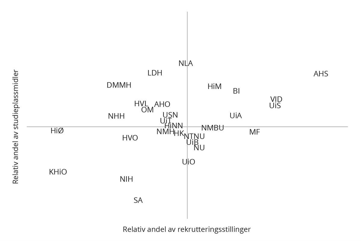 Jo lavere undervisningsomfang pr. årsverk finansiert over rammebevilgningen, jo større muligheter har institusjonene til å drive forskning finansiert over rammebevilgningen