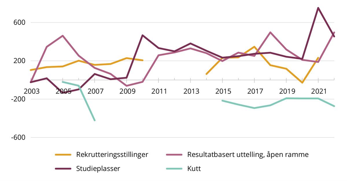 I perioden 2013 til 2021 har KDs rammebevilgning til institusjonene for sektoren samlet sett økt med 13,9 mrd. kroner nominelt. Det tilsvarer en realvekst på 15,3 prosent (5,5 mrd. kroner). De statlige institusjonene med høyest realvekst er UiS, OsloMet, HVL, UiA, HINN og USN. De med lavest realvekst er UiO, UiT, UiB, NMBU og NTNU.