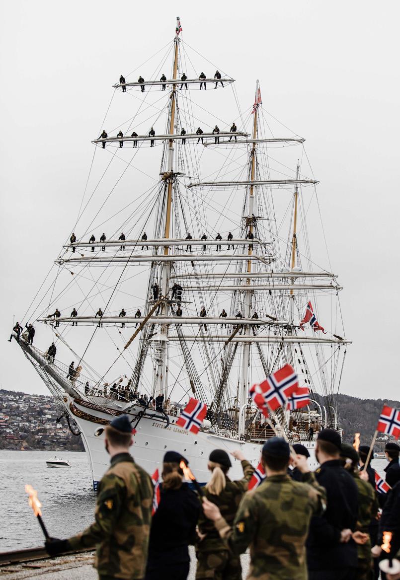 «KNM Statsraad Lehmkuhl» legger til kai på Sjøkrigsskolen i Bergen, etter to uker på sjøen med førsteårskadettene om bord. Foto: Helene Synes / Forsvaret