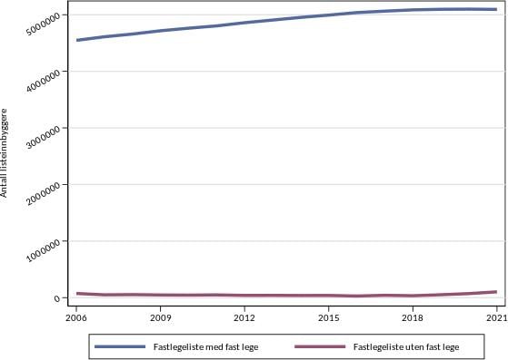 Figur 2-7 Antall listeinnbyggere over tid, med og uten fastlege