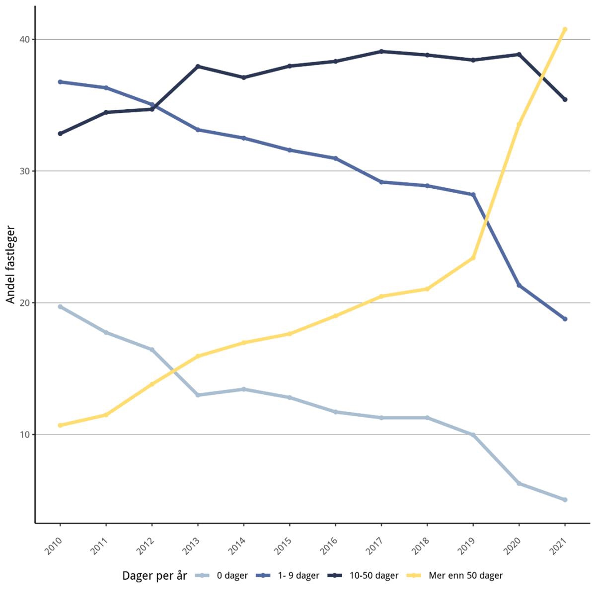 Merknad: Dager med arbeid utenfor normal arbeidstid er definert som minimum tre spesifikke takster i perioden kl. 17.00-06.59 på hverdager eller i helgene. Inkluderer kun fastlegearbeid, definert som praksistyper/oppgjørskoder fastlege eller fastlønnet og spesifikke fastlegearbeid takstkoder i KUHR. Kilde: FLO og KUHR