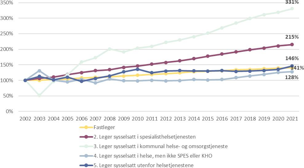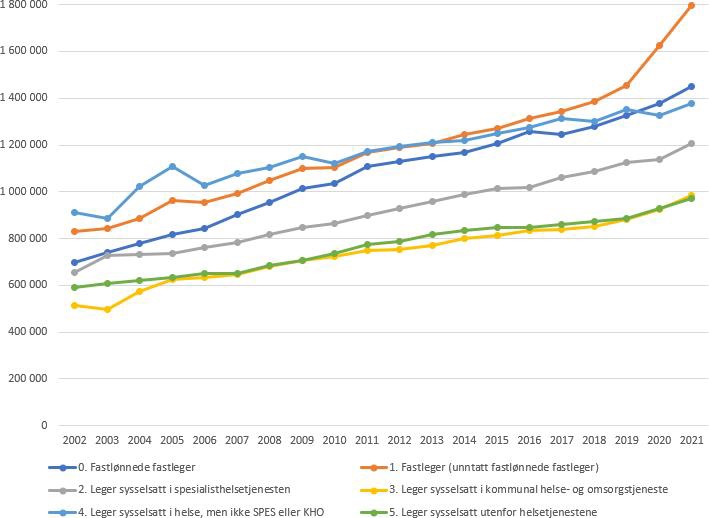 Merknad: For leger med yrkesinntekt over 1G, 2002 – 2021. Kilde: SSB