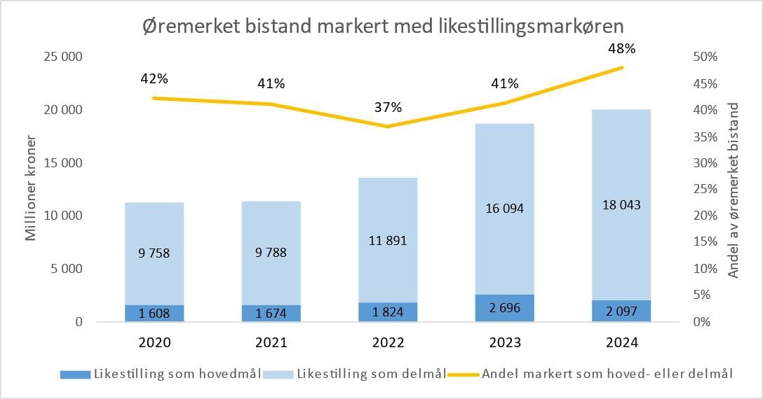 Norge har en politisk målsetting om at minst 50 % av øremerket bistand skal ha likestilling som hoved- eller delmål. I 2024 var andelen på 48 %, en økning fra 41 % i 2023.