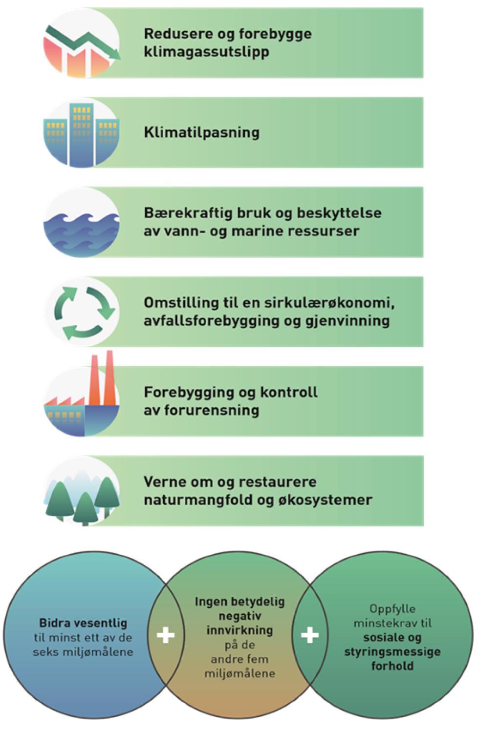 Som illustrert i figur 2.1, må en økonomisk aktivitet, for å kunne defineres som bærekraftig, bidra vesentlig til å nå minst ett av seks definerte miljømål. I tillegg skal aktiviteten ikke ha betydelig negativ innvirkning på de øvrige miljømålene, og den må oppfylle minstekrav til sosiale og styringsmessige forhold.