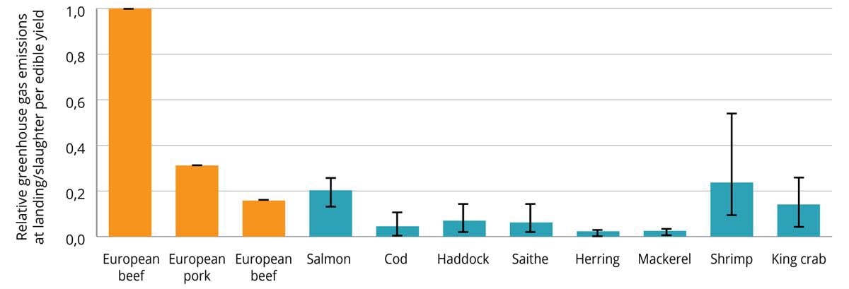 Figur 7.1 Klimautslipp av sjømat (blå søyler) ved landing/slakting vs. europeiske landbaserte kjøttprodukter (oransje søyler), relativt til europeisk storfe. De svarte søylene for sjømat representerer minimum og maksimumverdier med gjeldende produksjonspraksis. Tilsvarende estimater for minimum og maksimum, eller variasjon, er ikke tilgjengelig for landbaserte produkter i dataene som er benyttet.
