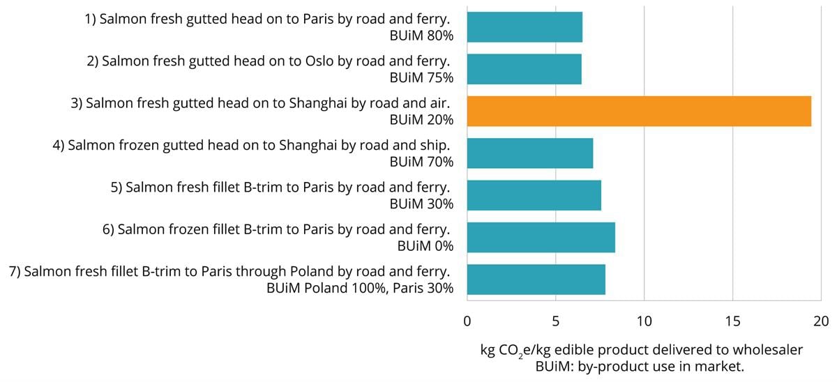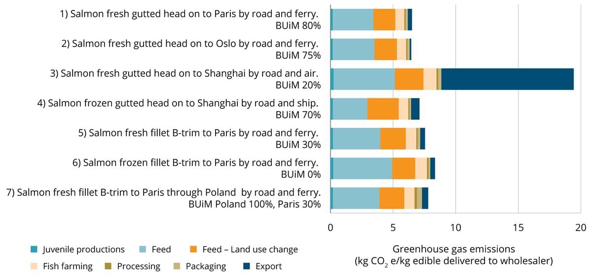 Som figuren over illustrerer, vil klimagassutslippet fra 1 kg laks ute i butikk avhenge av både transportform og hvilket marked den skal til. Ikke overraskende vil flyfrakt av fersk laks til Shanghai ha betydelig høyere klimautslipp enn en laks på lastebil til Paris. Hvis vi tar utgangspunkt i oppdrettslaksen ut fra oppdrettsanlegget tilsvarer utslippet 5,3 kg CO₂e/kg for laks produsert i 2017, hvorav 1,6 tilskrives såkalt land usechange, LUC (arealbruksendringer primært i forbindelse med bruk av soya i fiskefôret). Videre viser resultatene fra analysen at klimagassutslipp fra produksjon og transport av fôret utgjør mellom 73 og 80 pst. av de totale utslippene fra laksen levert til butikk (med unntak av laks som blir fraktet med fly).
