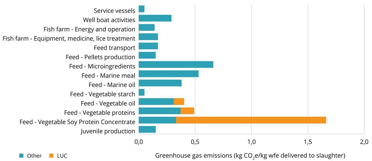 Figur 7.4 Klimagassutslipp i kg CO₂e per kg levende laks ved oppdrettsmerd fordelt på ulike prosesser i livsløpet fra fôrråvare og frem til slakteklar laks. Bidrag fra direkte arealbruksendring via fôrråvarene er skilt ut.