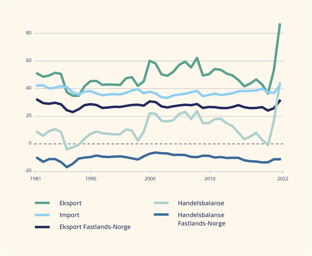 Internasjonal handel har tjent oss svært godt. Uten handel ville den enorme velstandsutviklingen vi har vært vitne til i Norge de siste tiårene ikke vært mulig. Hele verden skal gjennom et grønt skifte og inntektene fra olje og gass vil derfor falle betydelig. Det påvirker også Norges handelsbalanse. Norsk økonomi skal gjennom en storstilt omstilling. Dette innebærer både at vi skal kutte utslipp, men også at vi trolig skal gjøre noen andre ting enn vi gjør i dag. Det gjelder også resten av verden, som skal omstille seg bort fra fossil til fornybar energi. Dette vil ha konsekvenser for olje- og gassnæringene, som i dag er Norges desidert største eksportnæringer. For å opprettholde en viss balanse i utenriksøkonomien over tid, er det derfor viktig at vi øker eksporten fra andre verdiskapende næringer. Valutainntektene fra Statens pensjonsfond utland (SPU) vil også bidra positivt, men det er ikke sikkert at det er tilstrekkelig for å kunne betale for den importen som fremtidige generasjoner vil måtte ønske og ha behov for. Norge er i likhet med de fleste andre land tjent med at utenriksøkonomien over tid er i balanse. Dette gjelder både vare- og tjenestebalansen og betalingsbalansen.