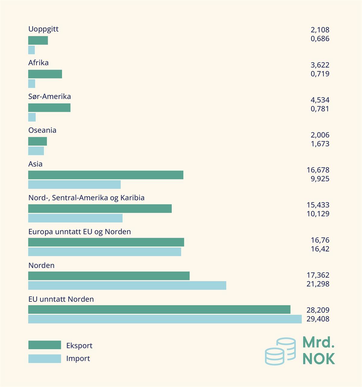 Figur 7.2 Tjenestehandel med regioner og verdensdeler for tredje kvartal 2023, i mrd. kroner
