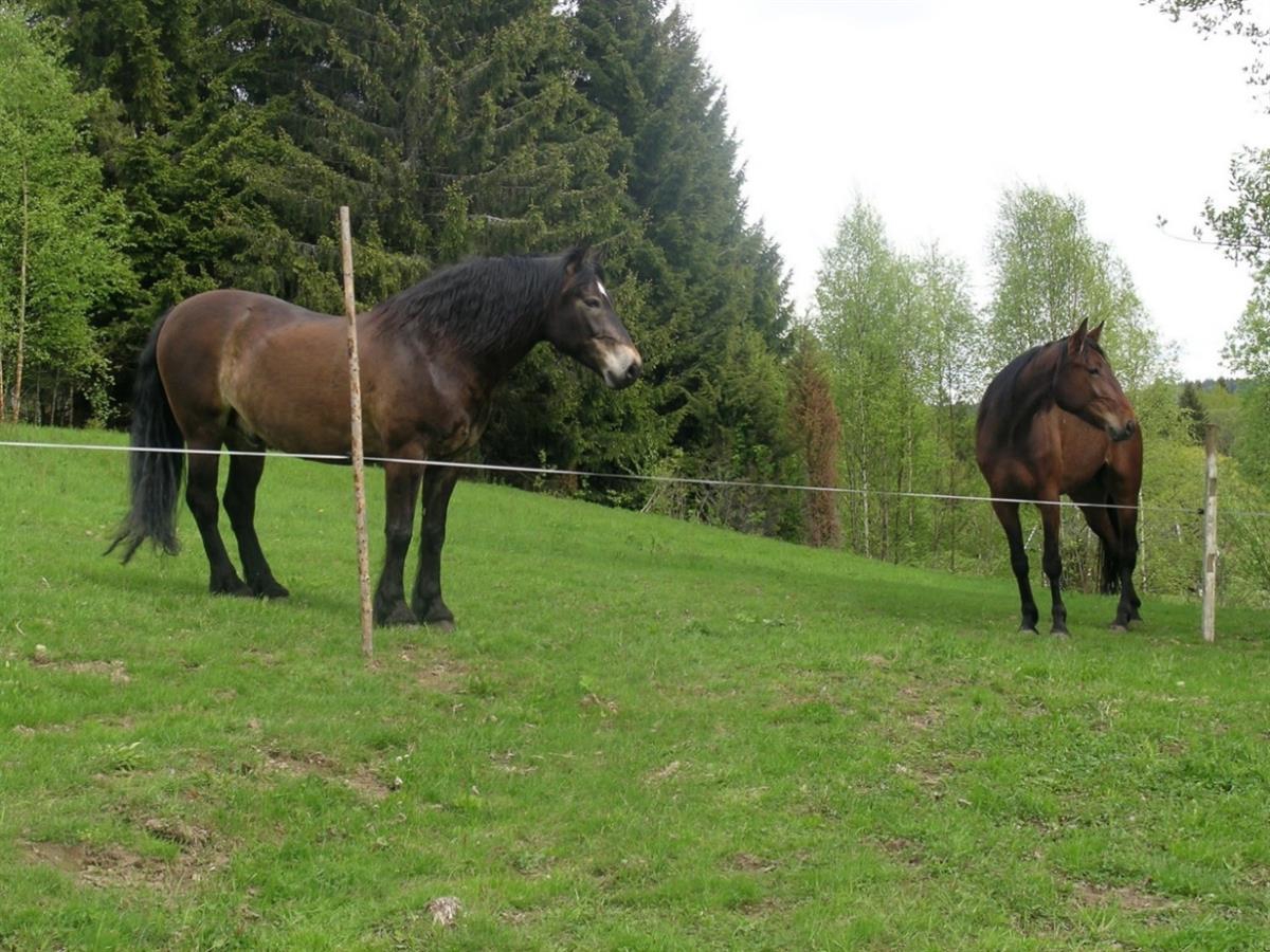 Kilde: Utegangshester med sommerpels. Varmblodstraver hoppe og føll, og Kaldblodstraver vallak. (Foto: Ingrid Lampe)