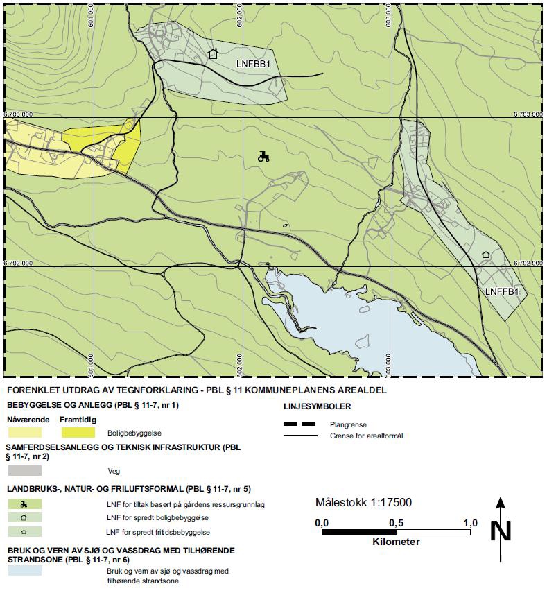 Eksempel på utsnitt fra kommuneplanens arealdel, illustrasjon på områder for spredt bolig- og fritidsbebyggelse i LNFR-område.