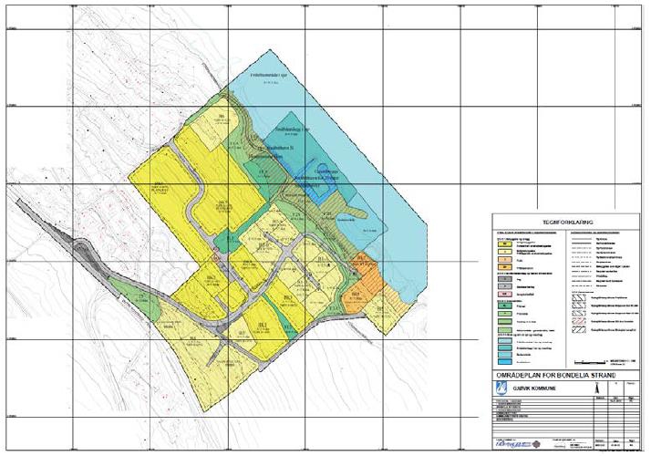 Eksempel på reguleringsplankart med tegnforklaring. Her vises blant annet arealformålelene boligbebyggelse i gult, grønnstruktur i grønt og bruk og vern av sjø og vassdrag i blått.
